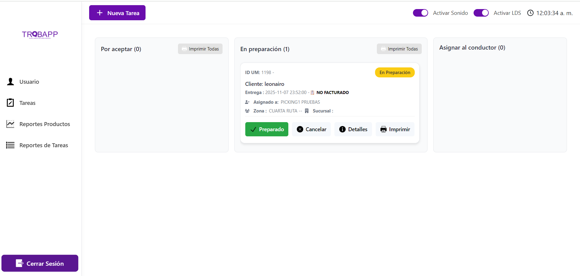 | Para asignar a conductor | Pedidos listos para despacho, que deben ser entregados al conductor o al equipo de transporte. |