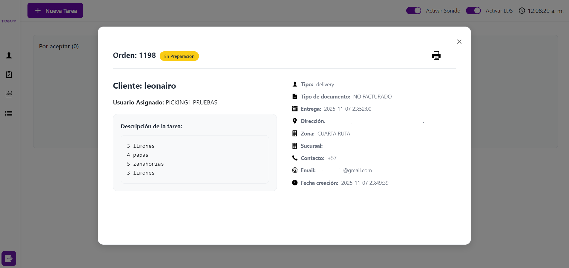 | Tareas | Acceso al módulo principal de gestión de pedidos y tareas asignadas. |